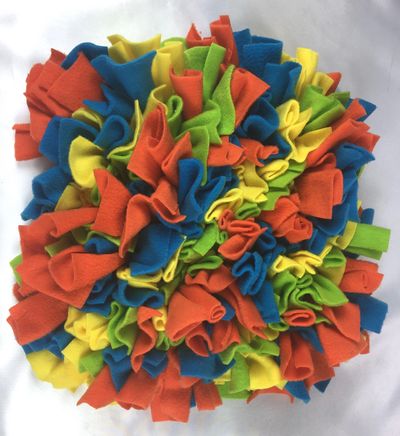 Our Snuffle Mats are hand tied with high quality fleece on a heavy duty rubber backing, akin to the type you find on the floor of a commercial kitchen. Each mat measures 12"x 12" and weighs approximately 2.5 lbs!