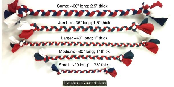 YANK! toys are made of 100% colorfast polyester fleece and are tightly hand-braided. There are an infinite number of color combinations available. Check out our fun stock of seasonal/holidays combinations, patriotic or military themes or the colors of your favorite sports teams. Treat your own furry friend, or bring one as a housewarming gift!